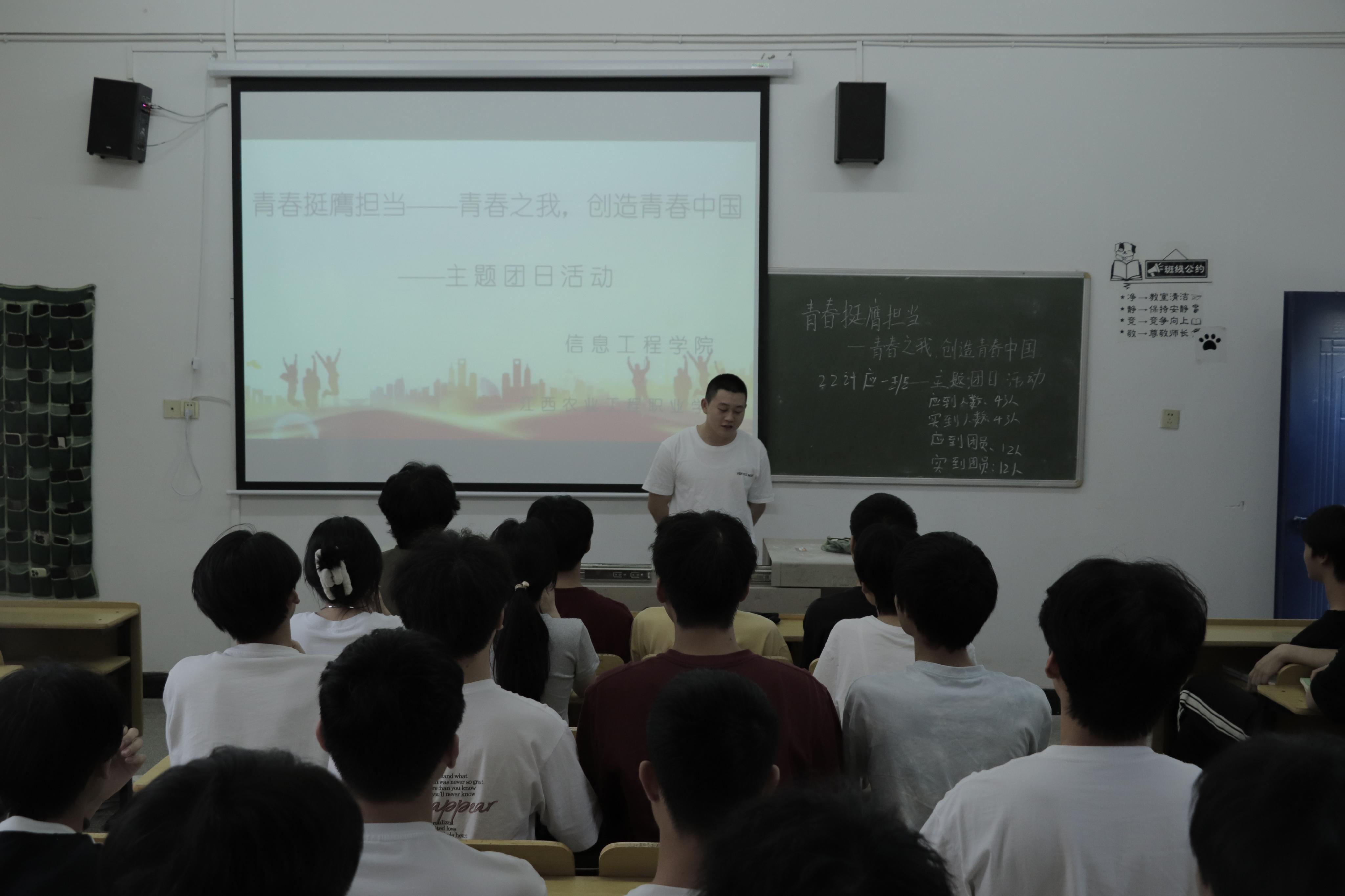 活动伊始,各班团支书带领团员青年们观看青年榜样的视频,让同学们了解到无数的青年人用自己的行动诠释着青春的担当,他们在各自的领域中努力拼搏,为实现中国梦奉献着自己的力量。在互动环节中,大家积极分享自己对青春的理解和对未来的憧憬。最后全体团员青年重温入团誓词,齐唱团歌。熟悉又庄严的誓词、激昂又振奋的旋律提醒着在场的每一位团员,要铭记团员使命,不忘入团初心,时刻提醒我们要在青春的舞台上,勇敢的担当起责任,用实际行动践行团员的誓言。