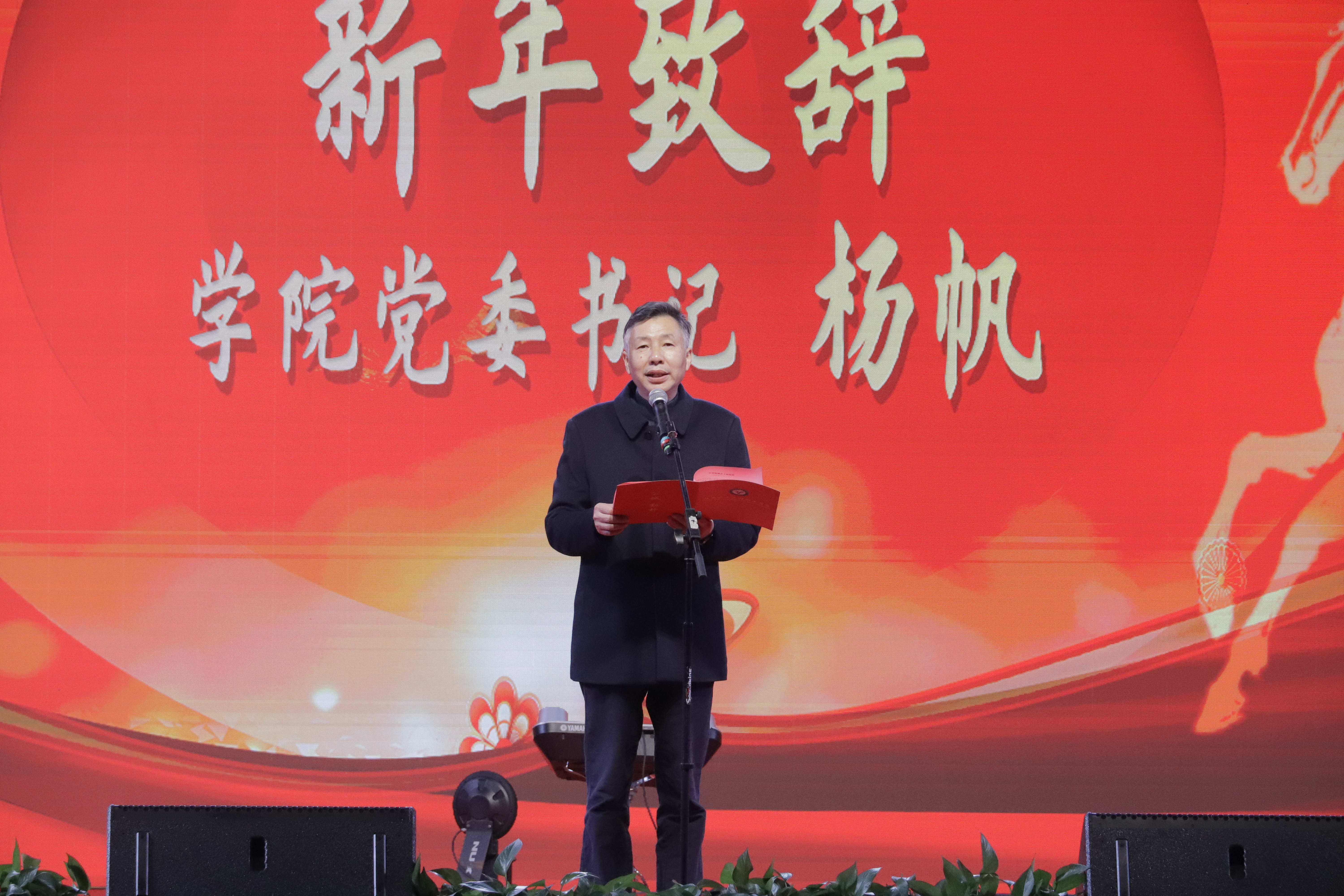 晚会开幕前,杨帆发表迎新致辞。他代表学院向坚守在教育教学一线的全体教职工致以崇高的敬意,向勤奋学习、拼搏奋进的全体学生送上新春的祝福。面对新的一年,他号召全校师生以骏马奔腾般的昂扬姿态攻克艰难、奋勇向前,在奋斗中实现成长,携手推动学校事业迈向新的阶段。