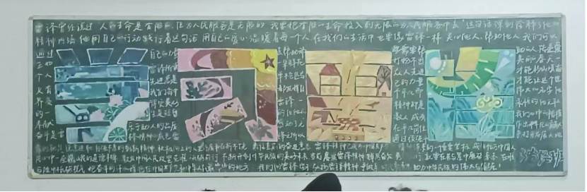 为弘扬雷锋精神,彰显时代担当,践行文明校园创建活动,进一步加强学生的思想道德建设,展现我校师生良好的精神风貌。在“学雷锋活动月”来临之际,学院团委组织开展“春风送暖,雷锋相伴”主题黑板报评比活动。