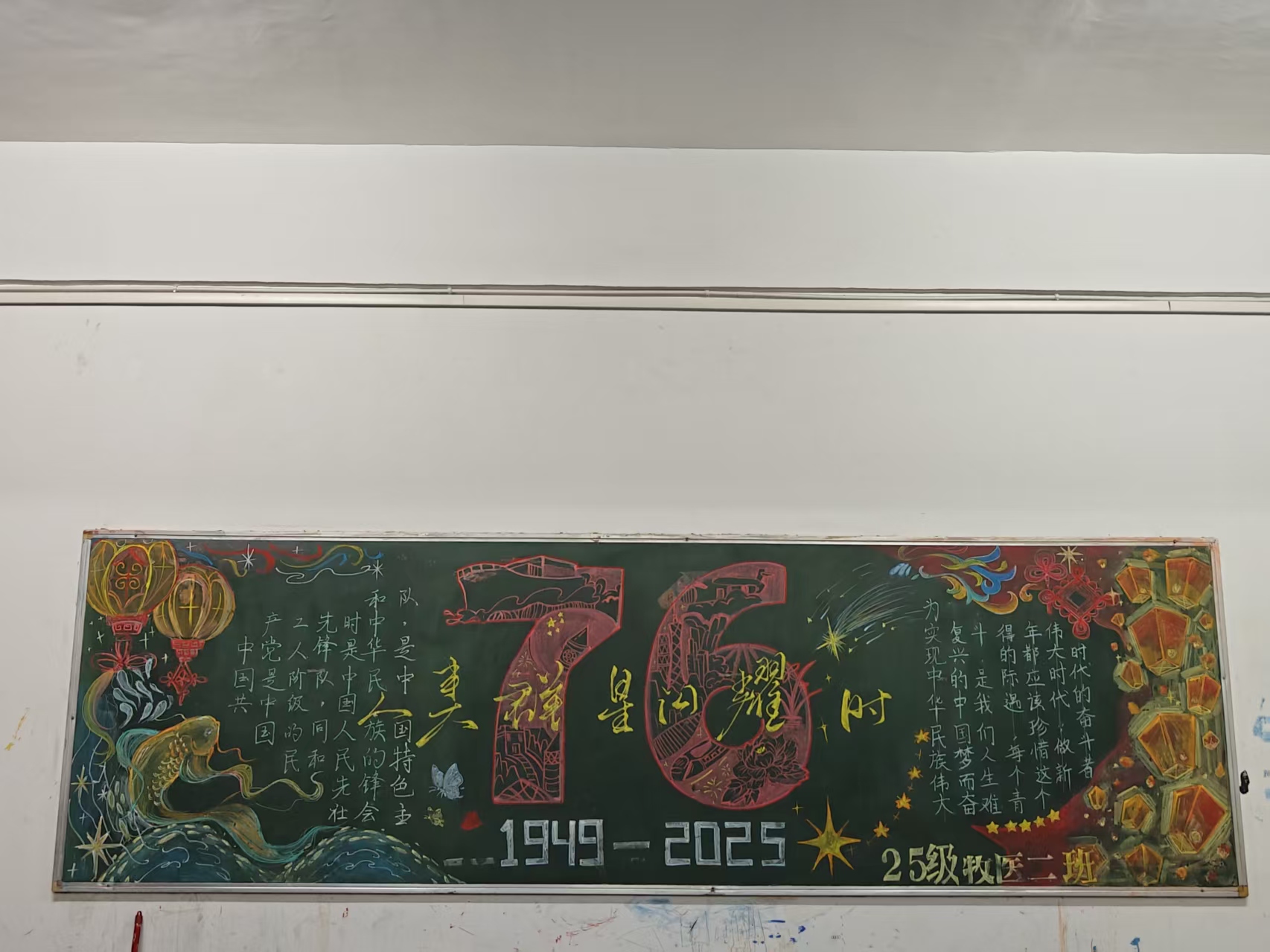 本次黑板报评比活动,既提升了同学们的团队协作能力,又进一步深化了同学们的爱国热情,强化了同学们的理想追求,促使个人理想与国家信念紧密融合,将同学们对祖国的热爱转化为前进动力,激励同学们为实现中国梦贡献青春力量。