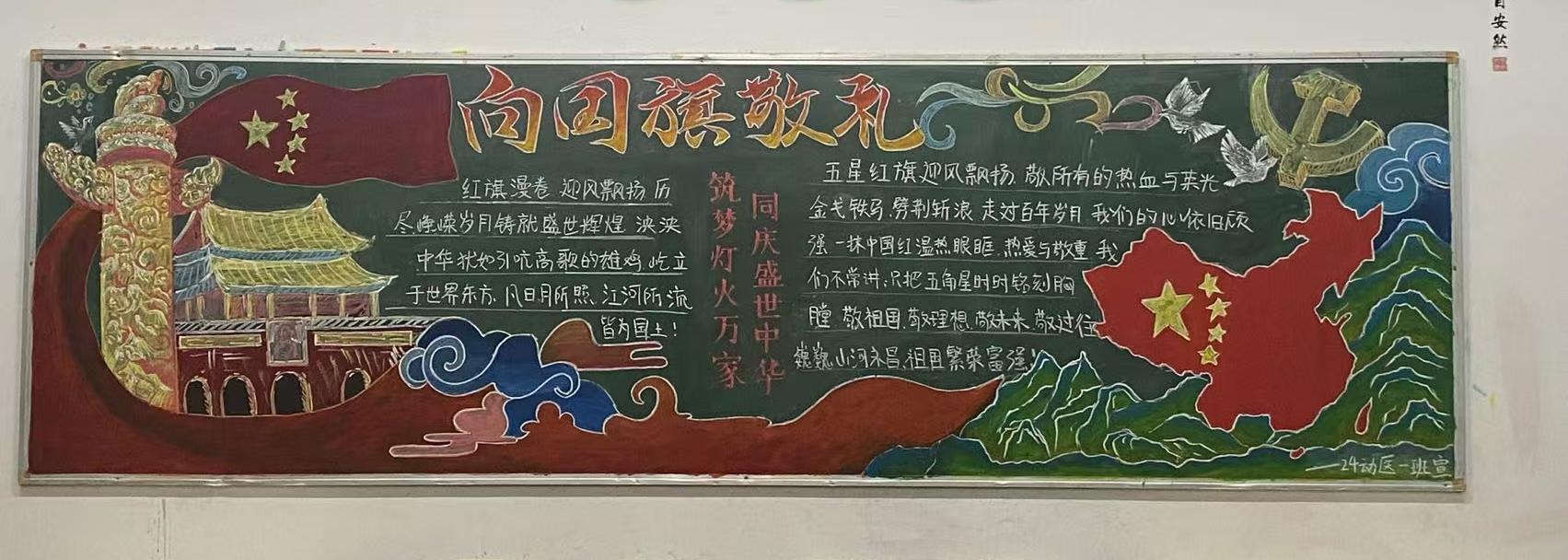 为庆祝中华人民共和国成立75周年,致敬伟大祖国,弘扬爱国主义精神,学院团委于10月组织开展了以“向国旗敬礼-青春致敬祖国”为主题的黑板报评比活动。