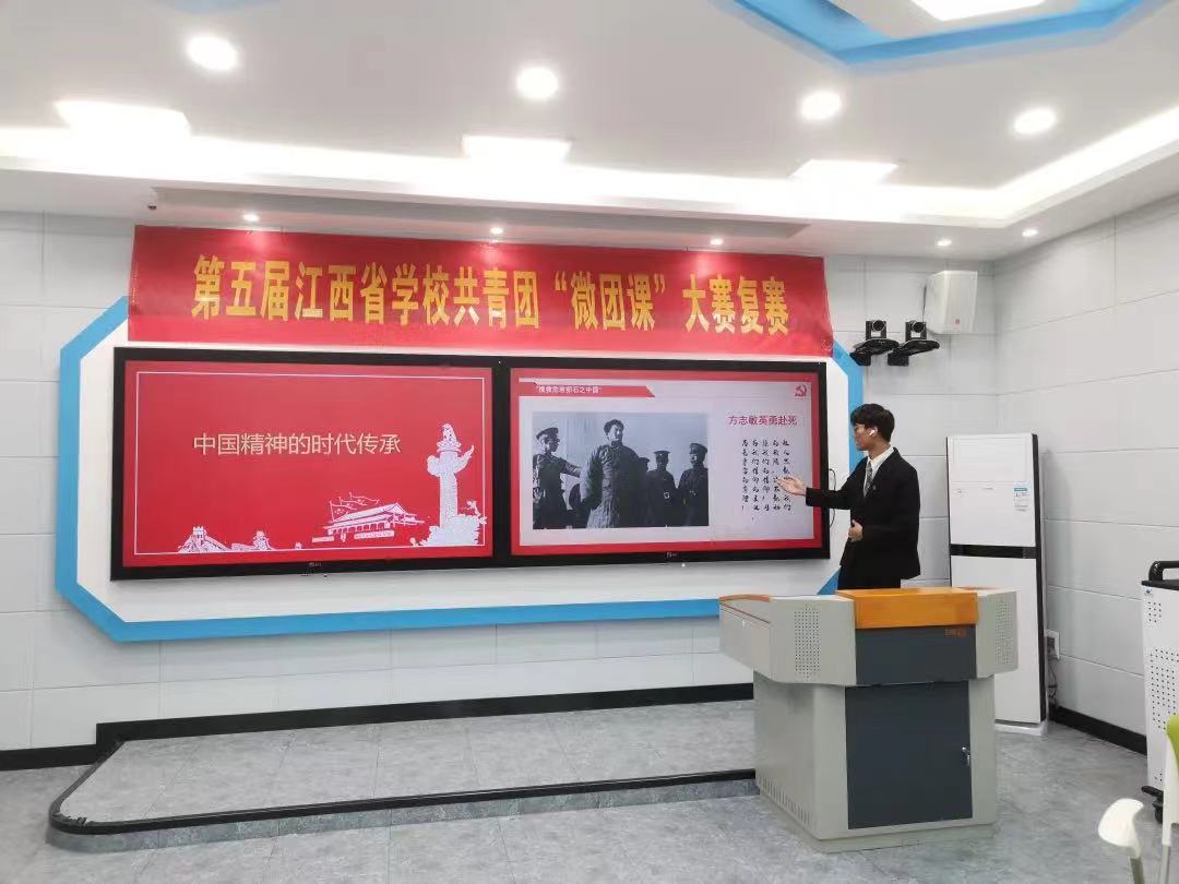 为深入贯彻学习近平新时代中国特色社会主义思想“进学校、进支部、进课堂”,丰富团课教学内容,创新团课教学形式。第五届江西省学校共青团“微团课”大赛复赛(学生组)于11月20日下午两点正式举行,20级室内设计一班李涛同学代表我校参加此次比赛。