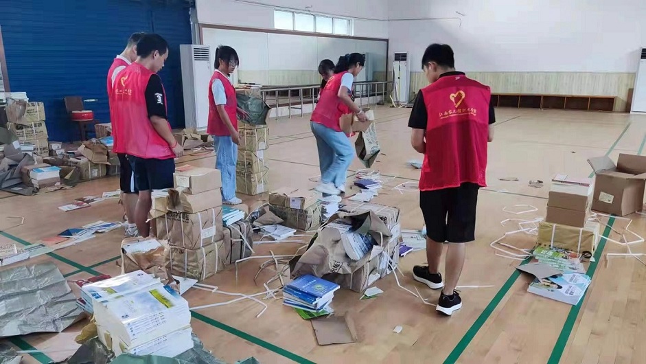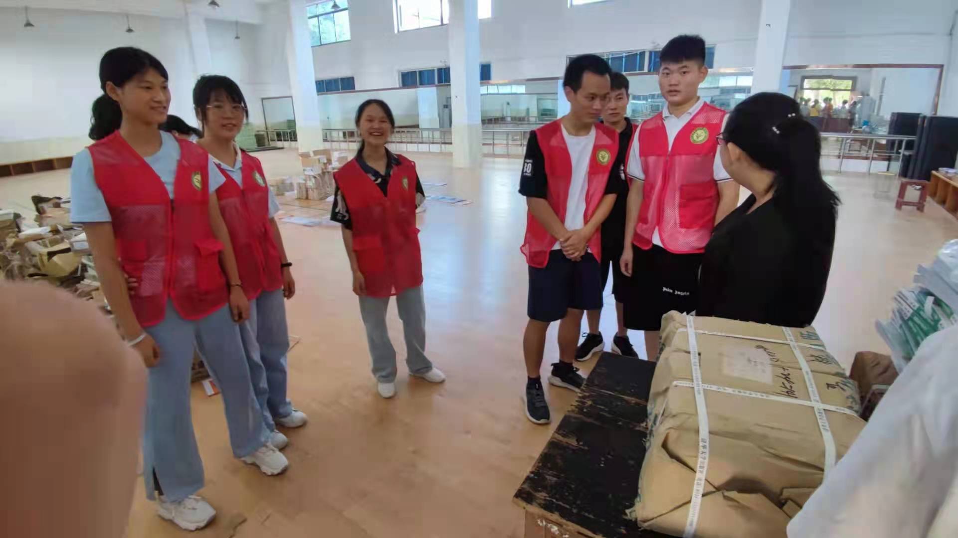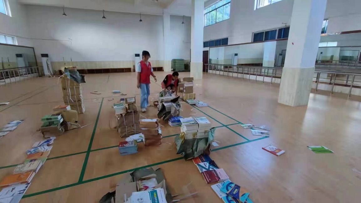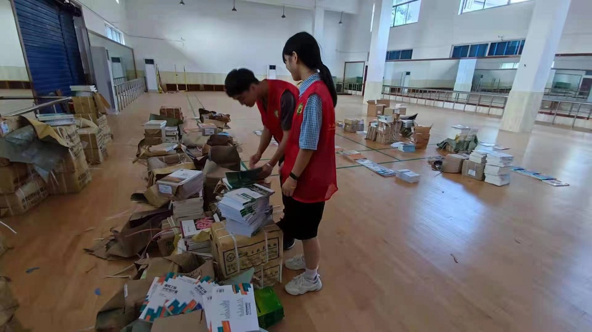 学校志愿者们在教务处老师的安排下各司其职,工作细致认真,发书井然有序地进行着,各班都准确无误地拿到了本班所需的书。