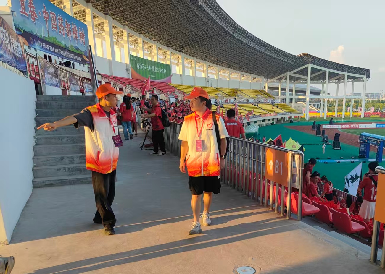 9月28日晚,樟树市体育中心灯火通明,2025年江西省城市足球超级联赛(赣超)第二阶段八强淘汰赛第二回合赛事在此激烈进行。应樟树团市委邀请,学院100余名师生组成志愿服务队,全程参与赛事保障工作。志愿者们凭借高效的服务与饱满的热情,为这场吸引10903名观众的焦点赛事注入青春力量。
