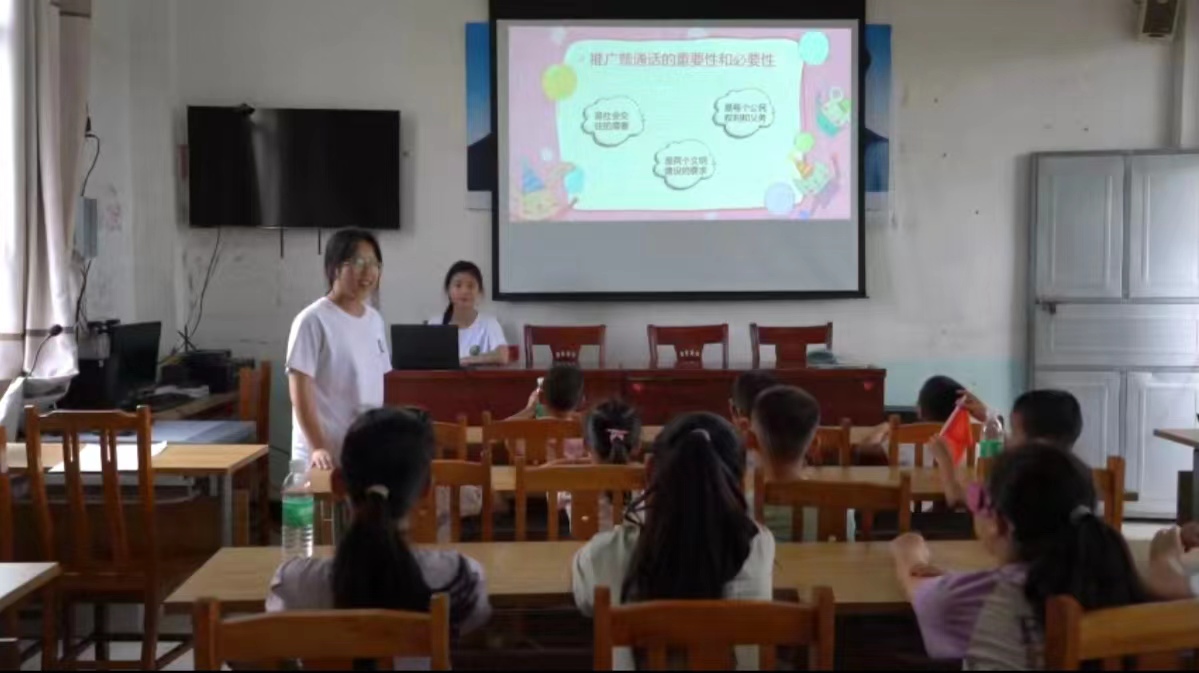 在叶坪镇志愿服务时,志愿者们根据走访问卷得出当地普通话普及不足的情况。随即在石岗小学对小朋友们开展普通话推广活动,带领小朋友们进行经典著作阅读和语言文字游戏,及时纠正错误发音,并教授一些生活常用并易读错的汉字。