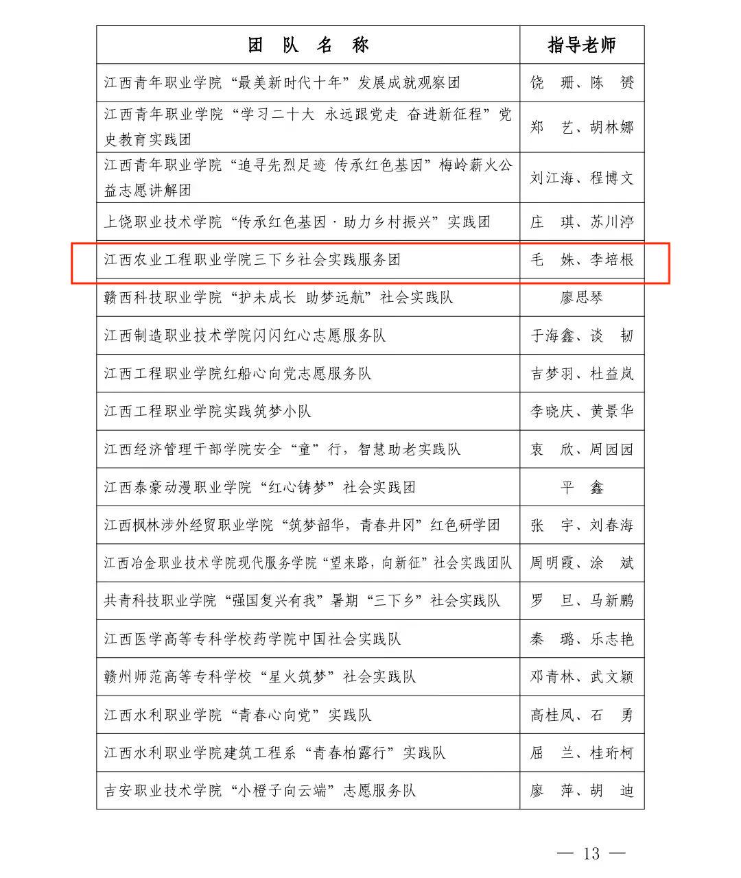 12月12日,中共江西省委宣传部、江西省文明办、江西省教育厅、共青团江西省委、江西省残疾人联合会、江西省学生联合会公布《关于2023年江西省大中专学生志愿者暑期“三下乡”社会实践活动的通报》。其中,我校三下乡社会实践服务团获得省优秀团队称号,我校李星宇、黄万书、徐妍三人获得省优秀个人称号。在“强国有我、青春有为”暑期社会实践活动中,我校胡原顺获得省优秀个人称号,张子涵、张娟等6人撰写的《助力乡村振兴,踔厉奋进新征程》获得优秀调研报告二等奖。