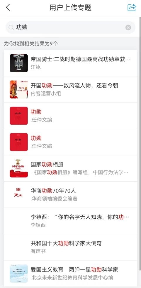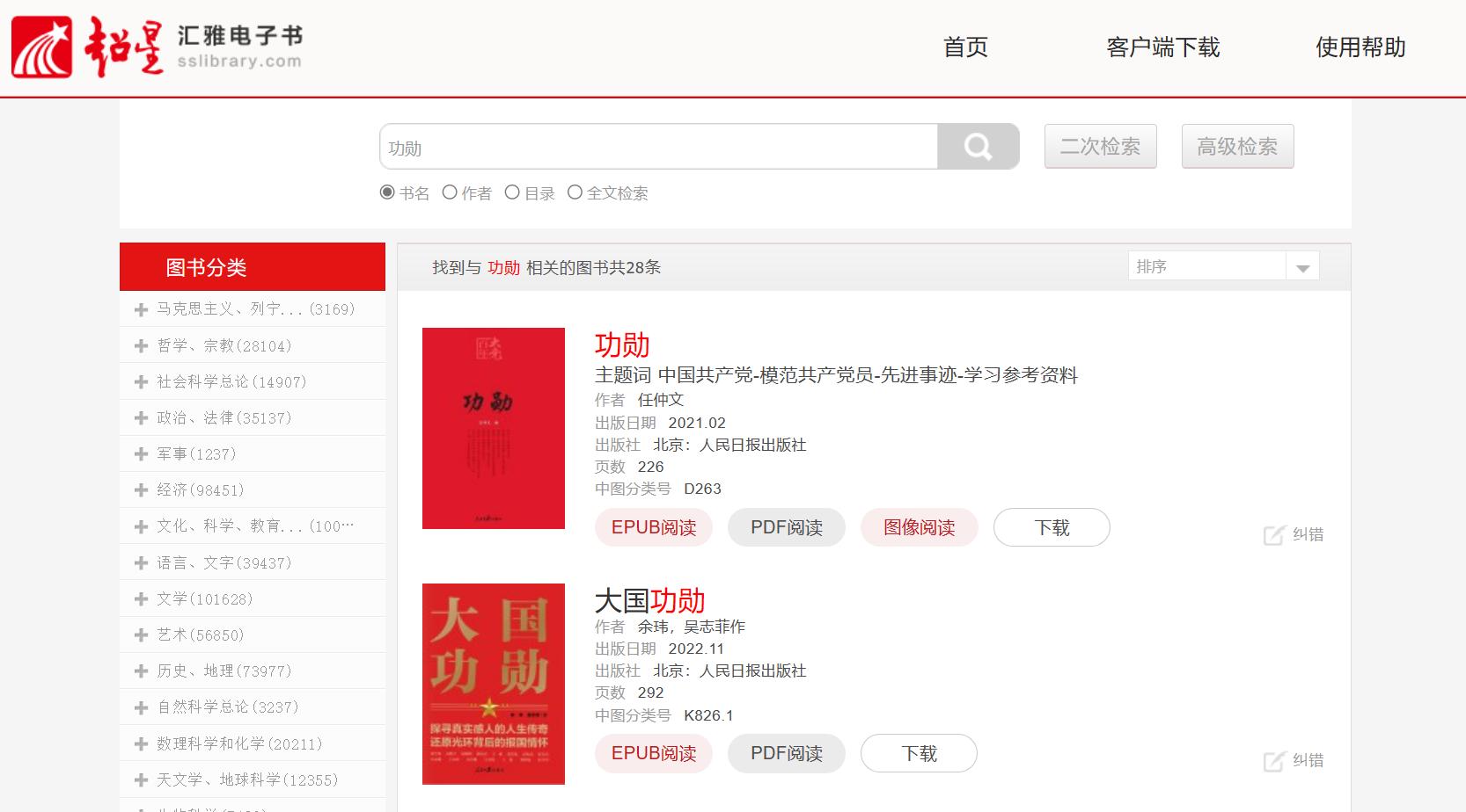 ①进入首页后,在“资源检索”模块中搜索书名或作者(例:书名《功勋》),在两个模块中会有显示,根据电子图书后期加工的情况显示在不同位置:文献、专题两个模块;